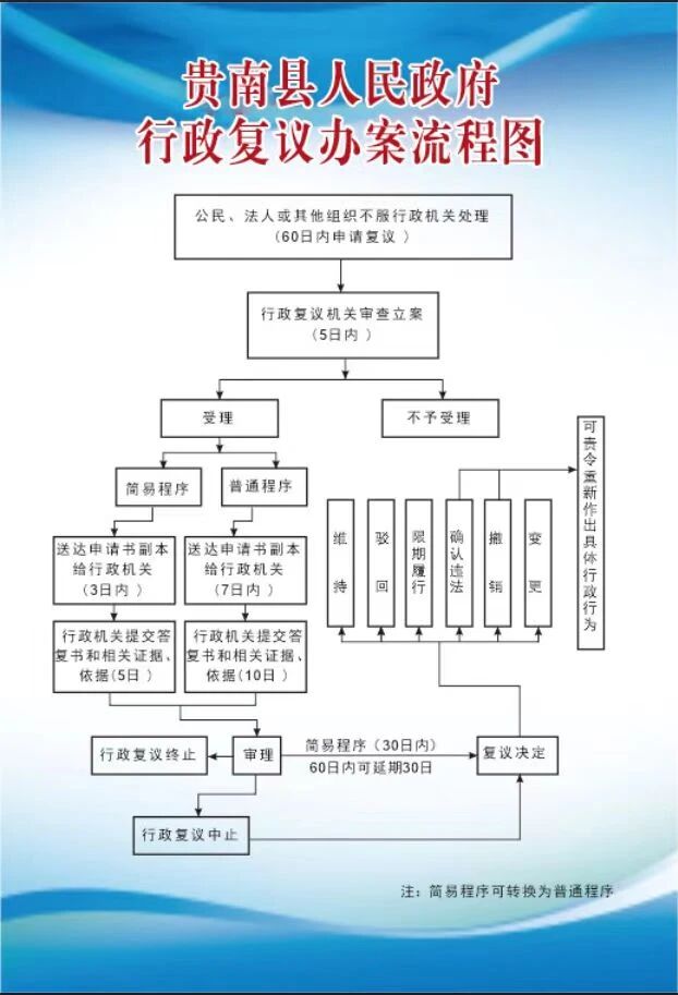 第六条有下列情形之一的,公民、法人或者其他组织可以依照本法申请行政复议:(一)对行政机关作出的警告、罚款、没收违法所得、没收非法财物、责令停产停业、暂扣或者吊销许可证、暂扣或者吊销执照、行政拘留等行政处罚决定不服的;(二)对行政机关作出的限制人身自由或者查封、扣押、冻结财产等行政强制措施决定不服的;(三)对行政机关作出的有关许可证、执照、资质证、资格证等证书变更、中止、撤销的决定不服的;(四)对行政机关作出的关于确认土地、矿藏、水流、森林、山岭、草原、荒地、滩涂、海域等自然资源的所有权或者使用权的决定不服的;(六)认为行政机关变更或者废止农业承包合同,侵犯其合法权益的;(七)认为行政机关违法集资、征收财物、摊派费用或者违法要求履行其他义务的;(八)认为符合法定条件,申请行政机关颁发许可证、执照、资质证、资格证等证书,或者申请行政机关审批、登记有关事项,行政机关没有依法办理的;(九)申请行政机关履行保护人身权利、财产权利、受教育权利的法定职责,行政机关没有依法履行的;(十)申请行政机关依法发放抚恤金、社会保险金或者最低生活保障费,行政机关没有依法发放的;(十一)认为行政机关的其他具体行政行为侵犯其合法权益的。第九条公民、法人或者其他组织认为具体行政行为侵犯其合法权益的,可以自知道该具体行政行为之日起六十日内提出行政复议申请;但是法律规定的申请期限超过六十日的除外。因不可抗力或者其他正当理由耽误法定申请期限的,申请期限自障碍消除之日起继续计算。第十二条对县级以上地方各级人民政府工作部门的具体行政行为不服的,由申请人选择,可以向该部门的本级人民政府申请行政复议,也可以向上一级主管部门申请行政复议。对海关、金融、国税、外汇管理等实行垂直领导的行政机关和国家安全机关的具体行政行为不服的,向上一级主管部门申请行政复议。第十九条申请人书面申请行政复议的,应当在行政复议申请书中载明下列事项:(一)申请人的基本情况,包括:公民的姓名、性别、年龄、身份证号码、工作单位、住所、邮政编码;法人或者其他组织的名称、住所、邮政编码和法定代表人或者主要负责人的姓名、职务;(三)行政复议请求、申请行政复议的主要事实和理由;第二十八条行政复议申请符合下列规定的,应当予以受理: (六)属于收到行政复议申请的行政复议机构的职责范围; (七)其他行政复议机关尚未受理同一行政复议申请,人民法院尚未受理同一主体就同一事实提起的行政诉讼。备注:信访制度与复议制度是两个截然不同且平行的制度,不能混同。如有咨询,请您拨打行政复议办公室电话进行咨询,电话:8505922524。